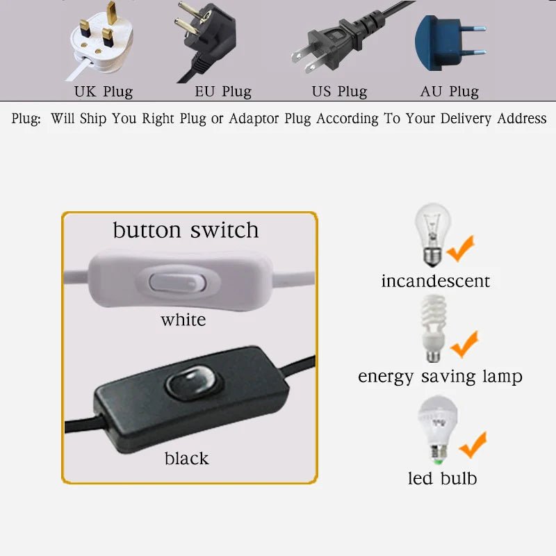 Equipped with a standard E27 socket and shipped with an energy-saving LED bulb, this lamp delivers a warm 3000 K glow ideal for reading, writing, or ambient accent lighting. The built-in knob switch provides quick on/off control without the need for hard-wired dimmers, and its universal AC power (90–260 V) with region-specific plug options (EU, US, UK) ensures easy setup.