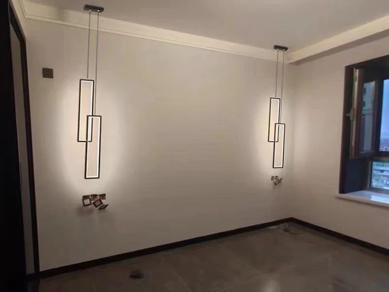 Modern rectangular LED chandelier with remote control. A stylish, energy-saving light fixture for dining rooms, task areas, and home decor.