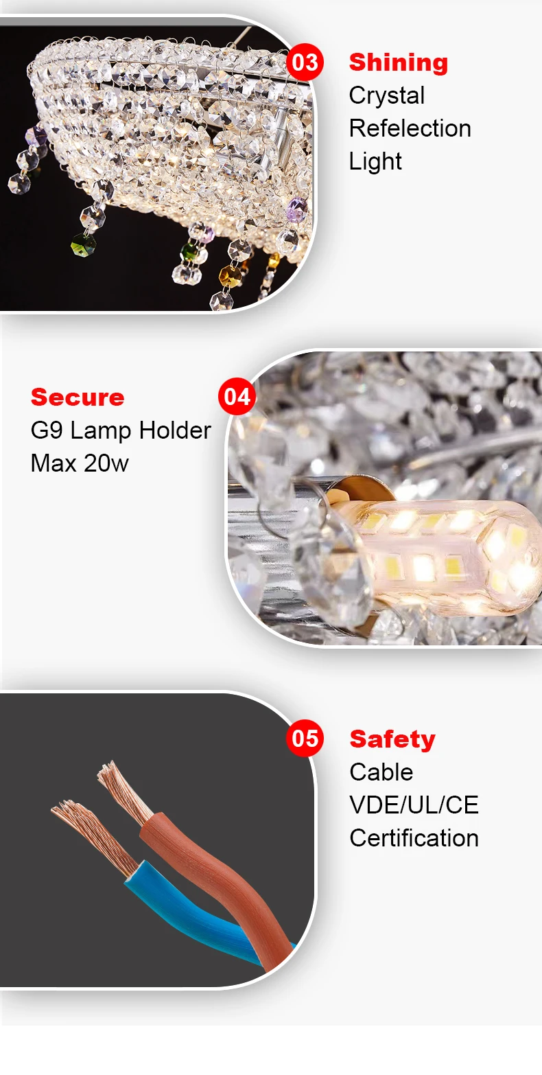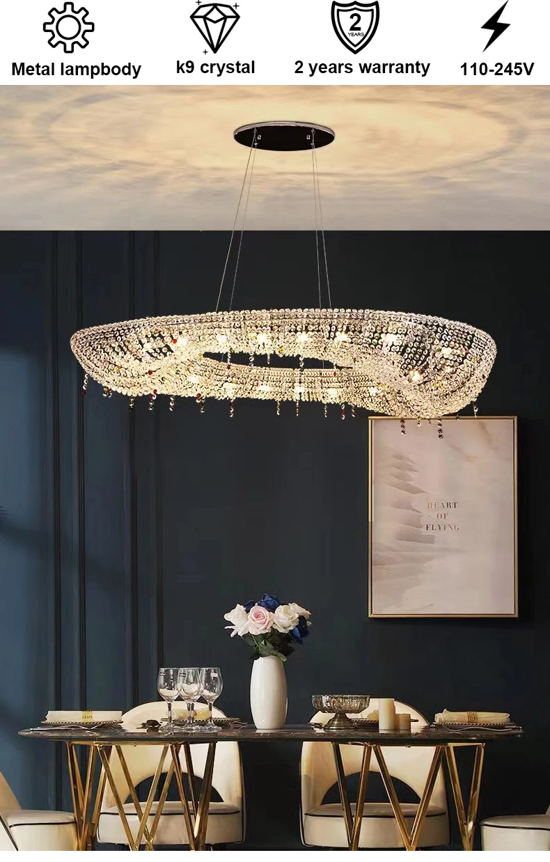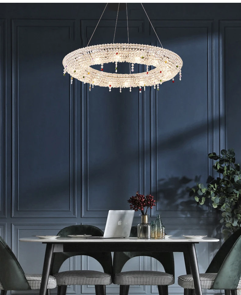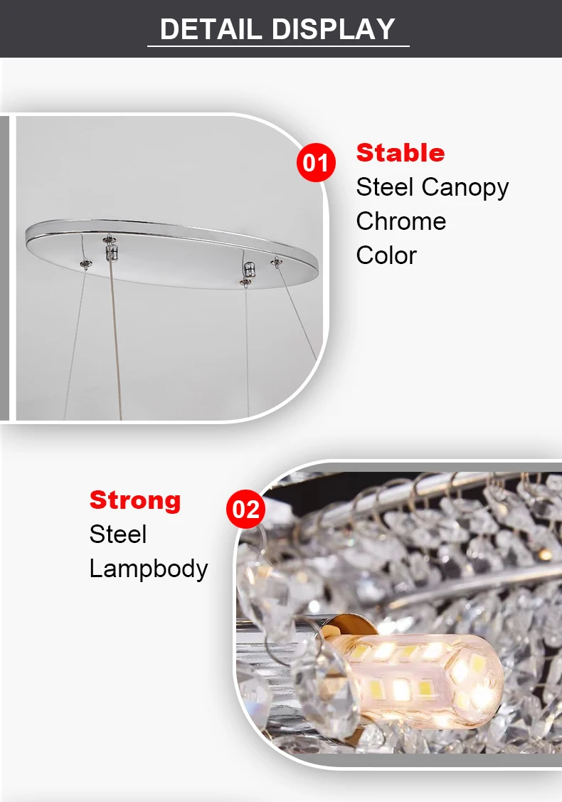 Its minimalist suspension frame in polished metal keeps the focus on the cascading crystals, creating a stunning centerpiece above dining tables, kitchen islands, or in grand entryways. The energy-efficient LED module ensures low power use and long life, while its dimmable driver (via wall dimmer) lets you shift from bright, task-ready downlights to a warm, mood-setting halo.