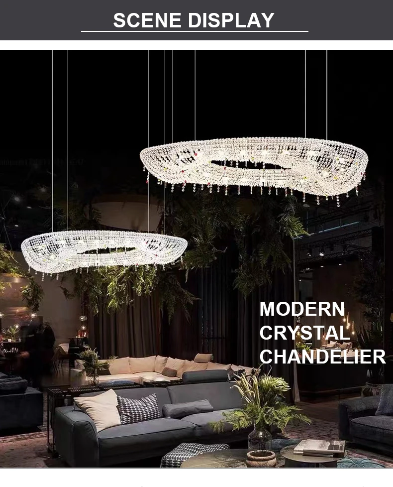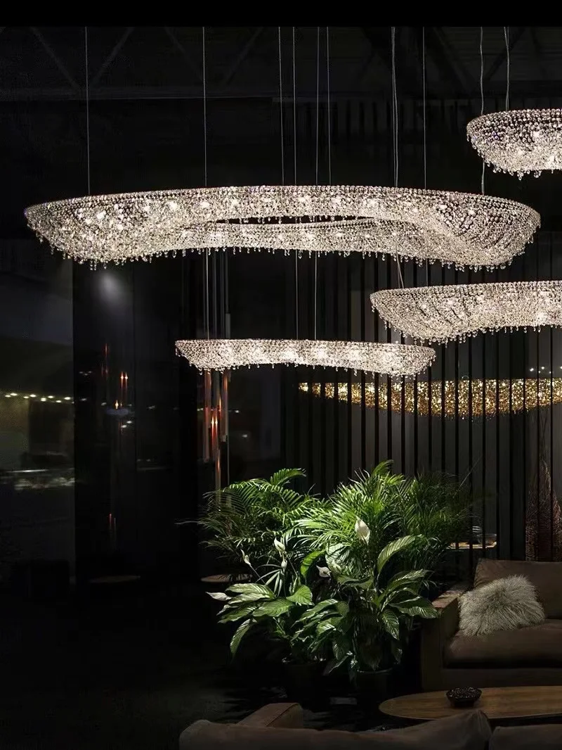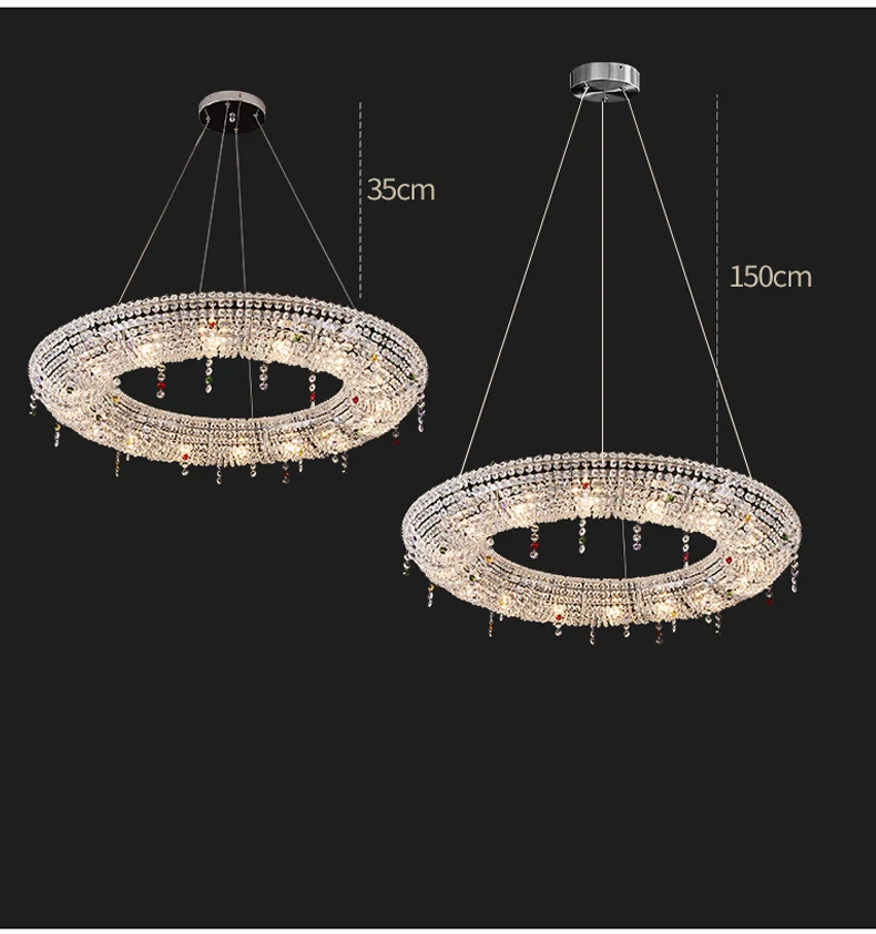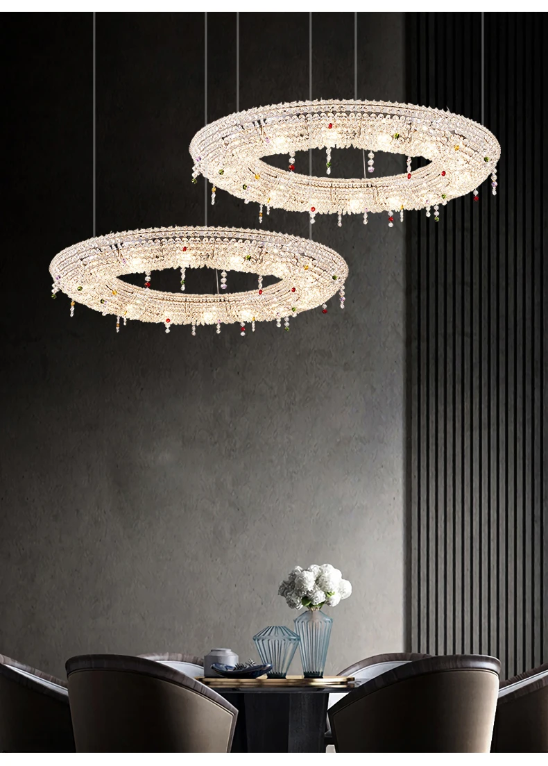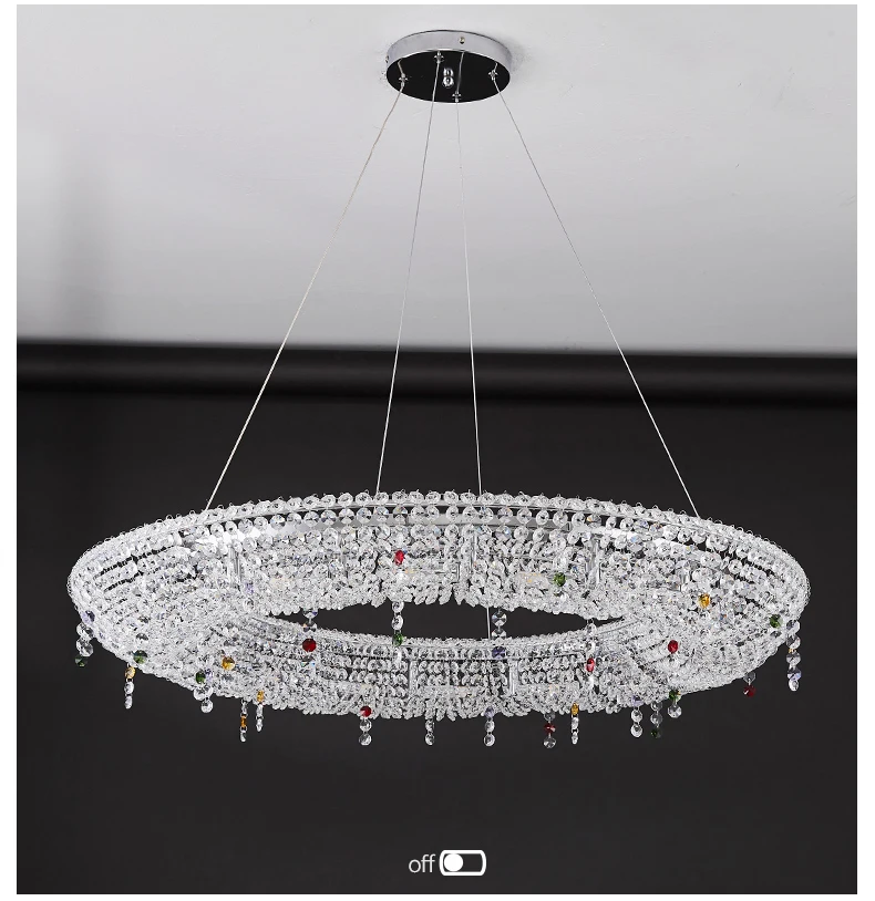 Its minimalist suspension frame in polished metal keeps the focus on the cascading crystals, creating a stunning centerpiece above dining tables, kitchen islands, or in grand entryways. The energy-efficient LED module ensures low power use and long life, while its dimmable driver (via wall dimmer) lets you shift from bright, task-ready downlights to a warm, mood-setting halo.