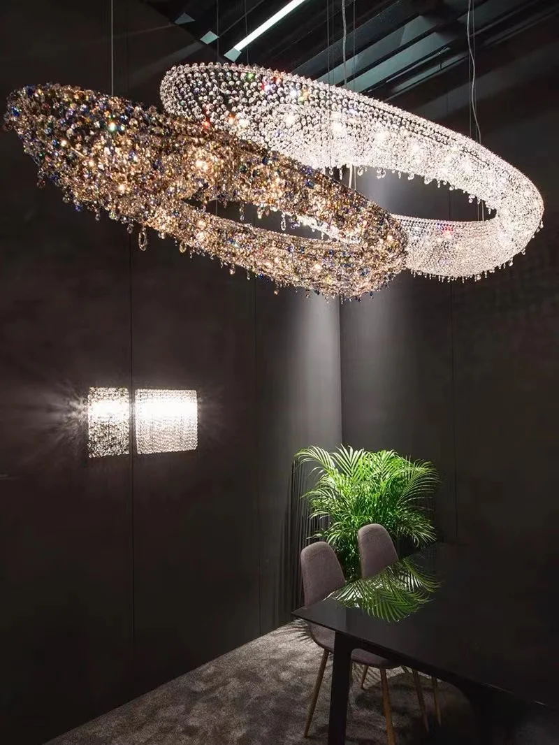 Luxurious crystal LED suspension chandelier. A modern ceiling light fixture offering dazzling accent and ambient lighting for dining rooms, foyers, or living spaces.