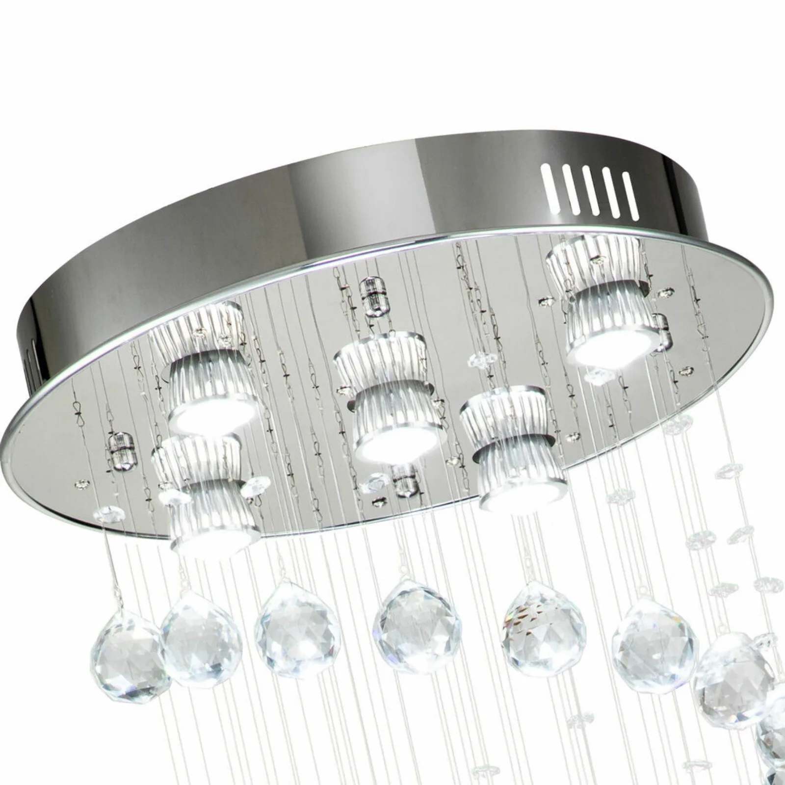 Perfect for staircases, foyers, entrance halls, or double-height ceilings, this striking fixture acts as both a lighting solution and an artistic centerpiece. The reflective crystals catch and scatter the integrated LED light, creating a dazzling glow from every angle.