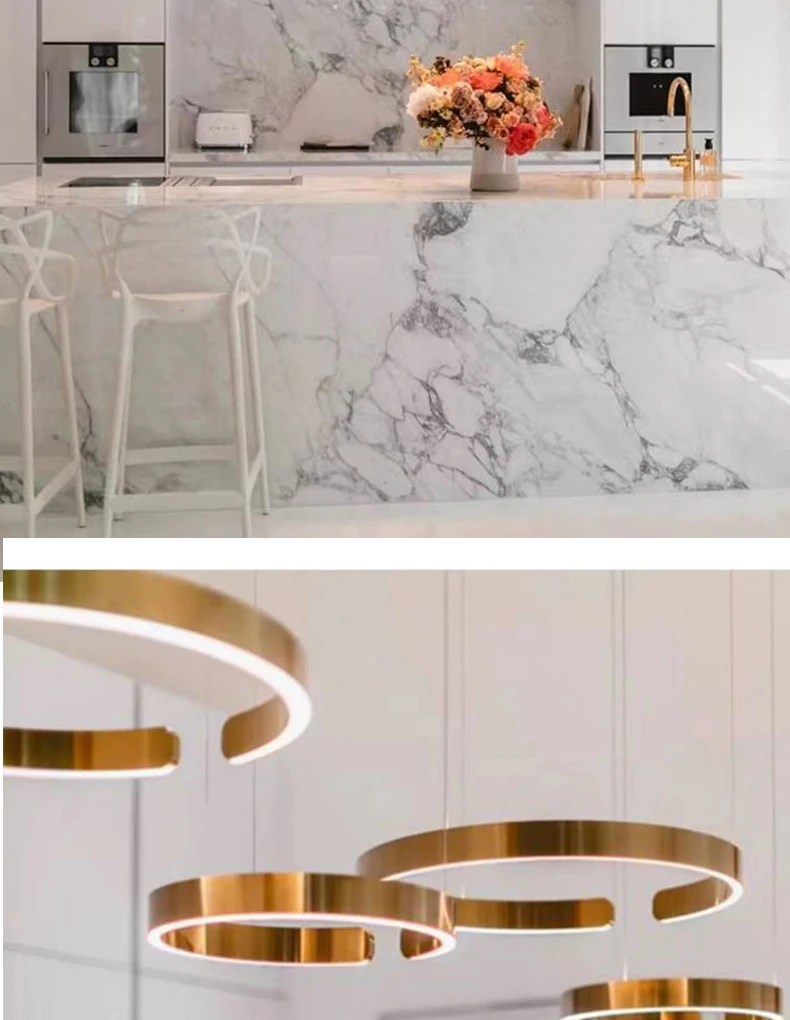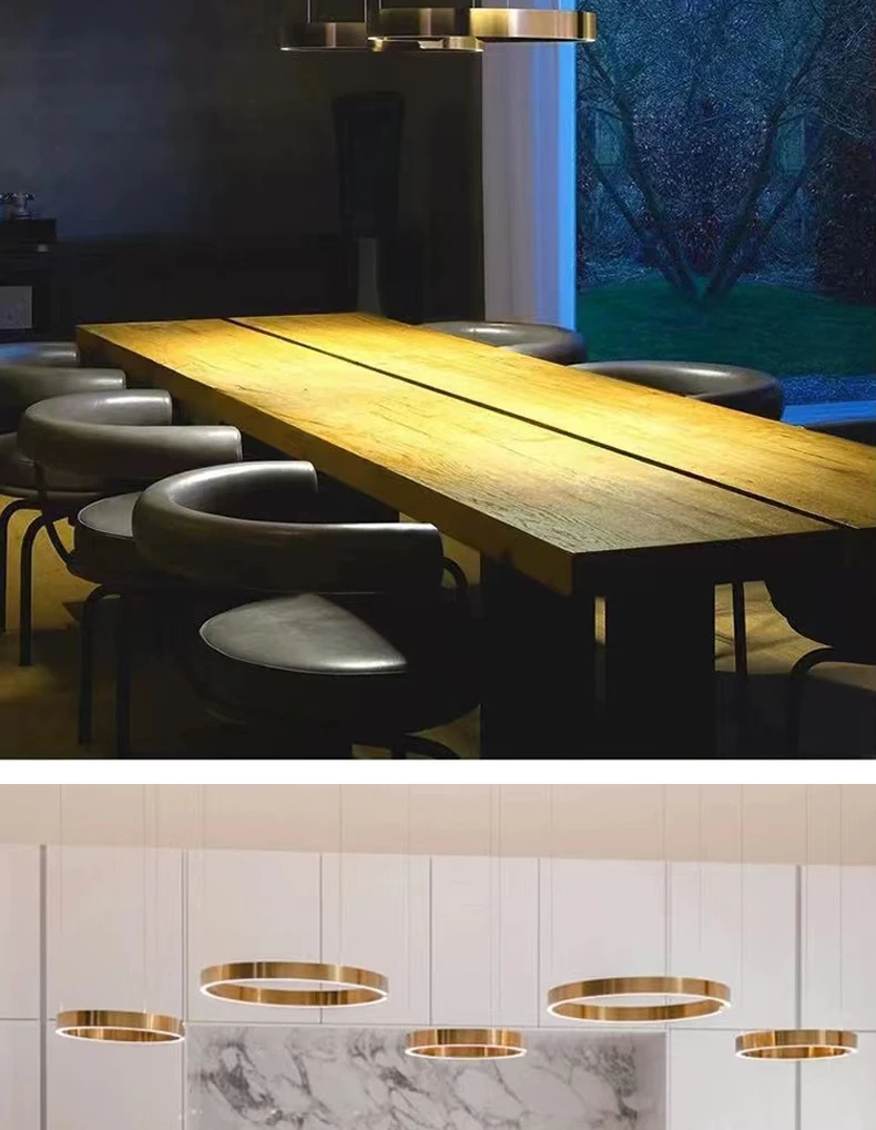 Sleek Nordic-style LED ring pendant light. A minimalist ceiling light fixture perfect for dining tables, kitchen islands, or modern living spaces.