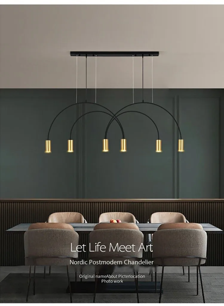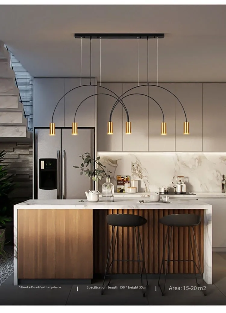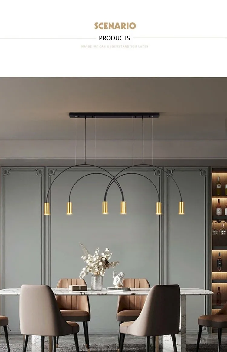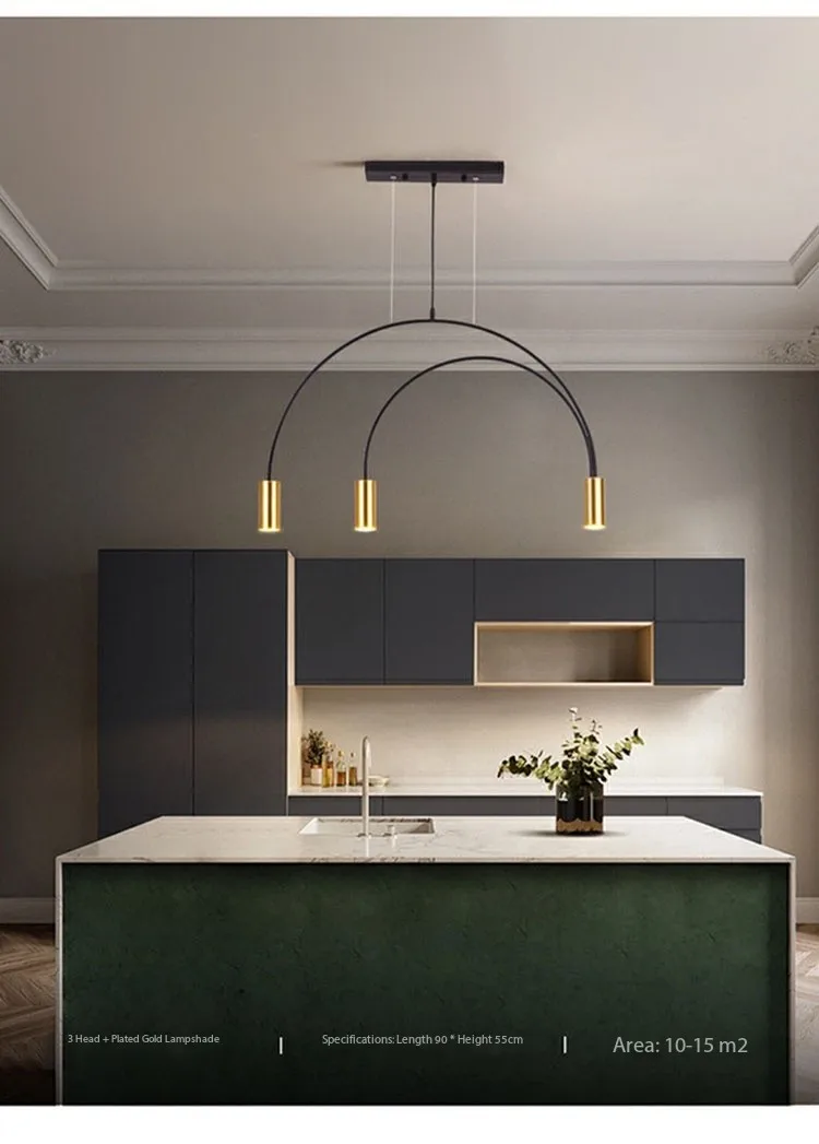 Sculptural arched LED hanging lamp with geometric lines. A modern pendant light fixture perfect for task lighting over islands or ambient accent lighting in living spaces.