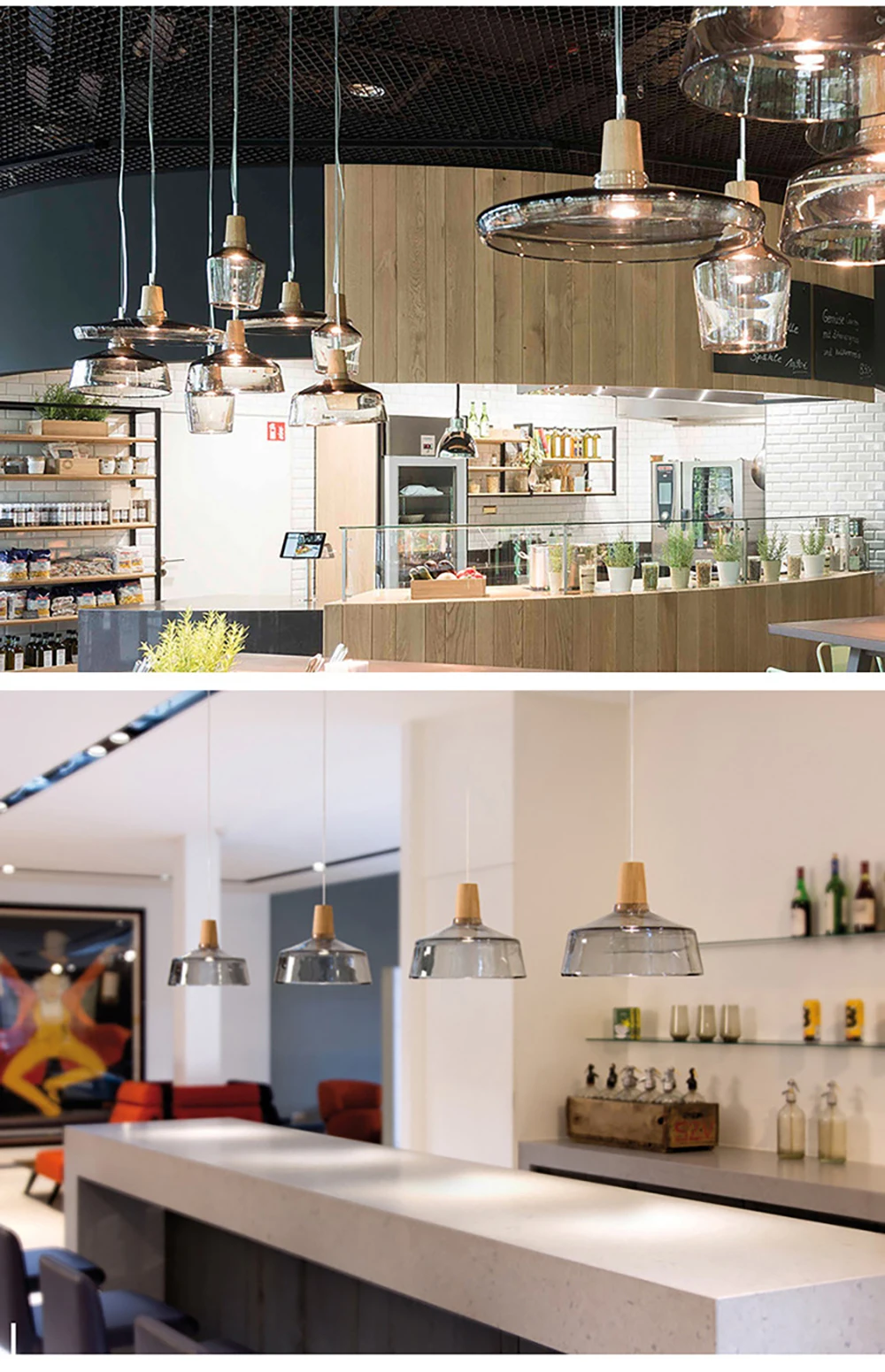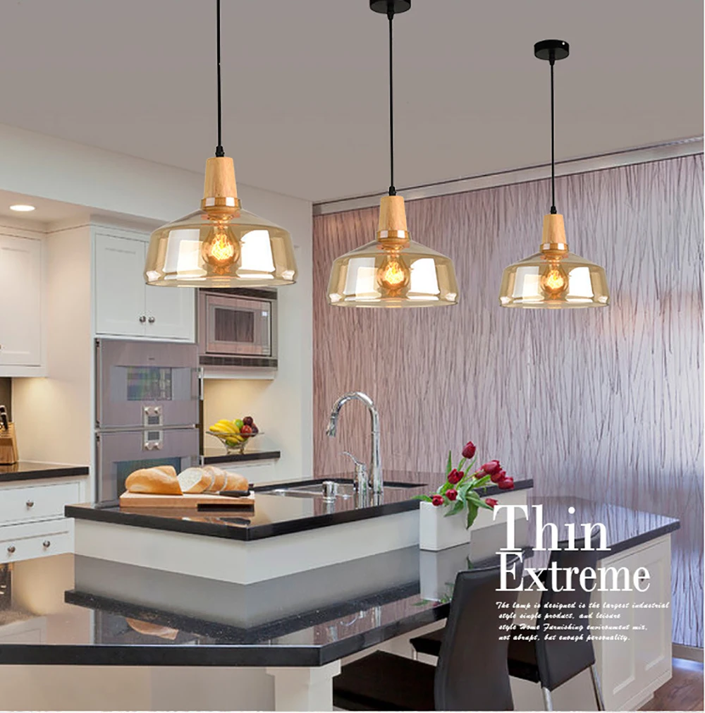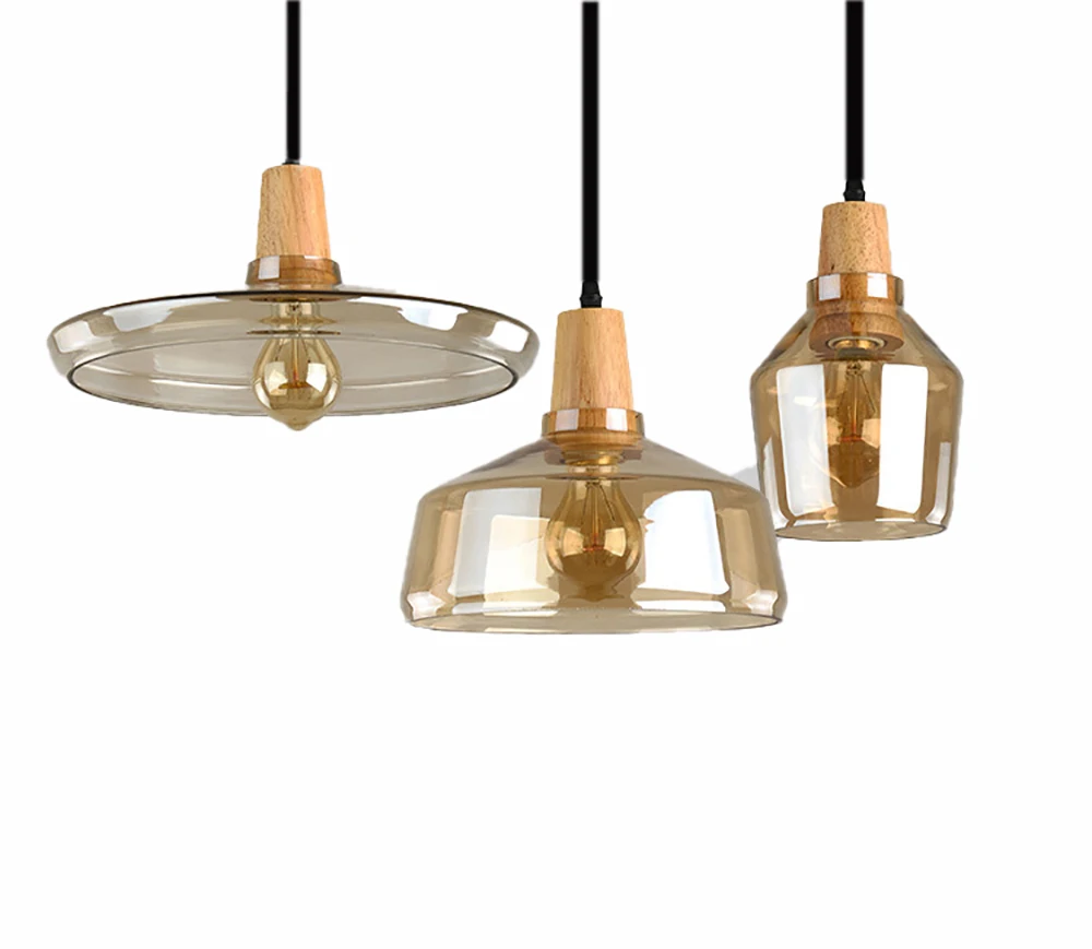 Vintage-style Nordic pendant light with wooden frame and glass shade. Cord pendant with E27 base, compatible with LED bulbs. Ideal for bedrooms, studies, and hotel rooms.