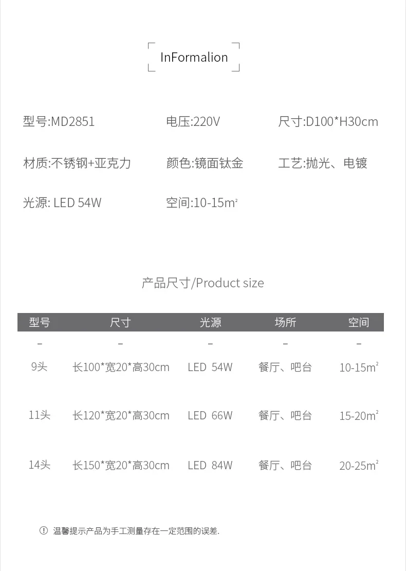 Size: 9 heads, length 100cm; 11 head length 120cm; 14 head length 150 cm; The Suspension wire is 120cm adjustable.
