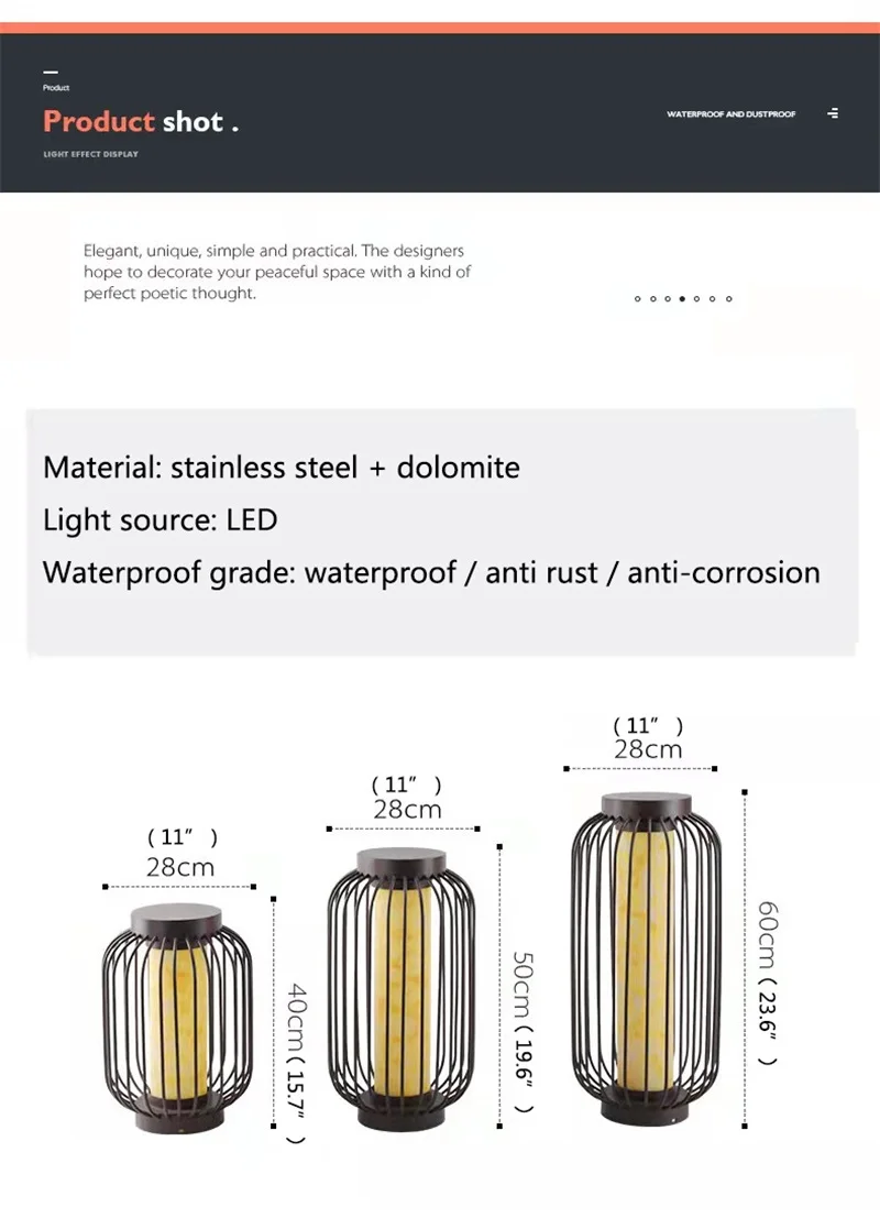 Illuminate your outdoor spaces with the Outdoor Dolomite Solar LED Lawn Lamp, a sculptural light fixture crafted from robust stainless steel and polished dolomite stone. Its built-in polysilicon solar panel charges the internal LED system (run on 12 V DC) with no hard wiring—simply place it in full sun for 6+ hours. At dusk, the lamp automatically casts a warm-white glow for up to 8 hours, turning your garden paths, courtyards, or park settings into enchanting nightscapes.