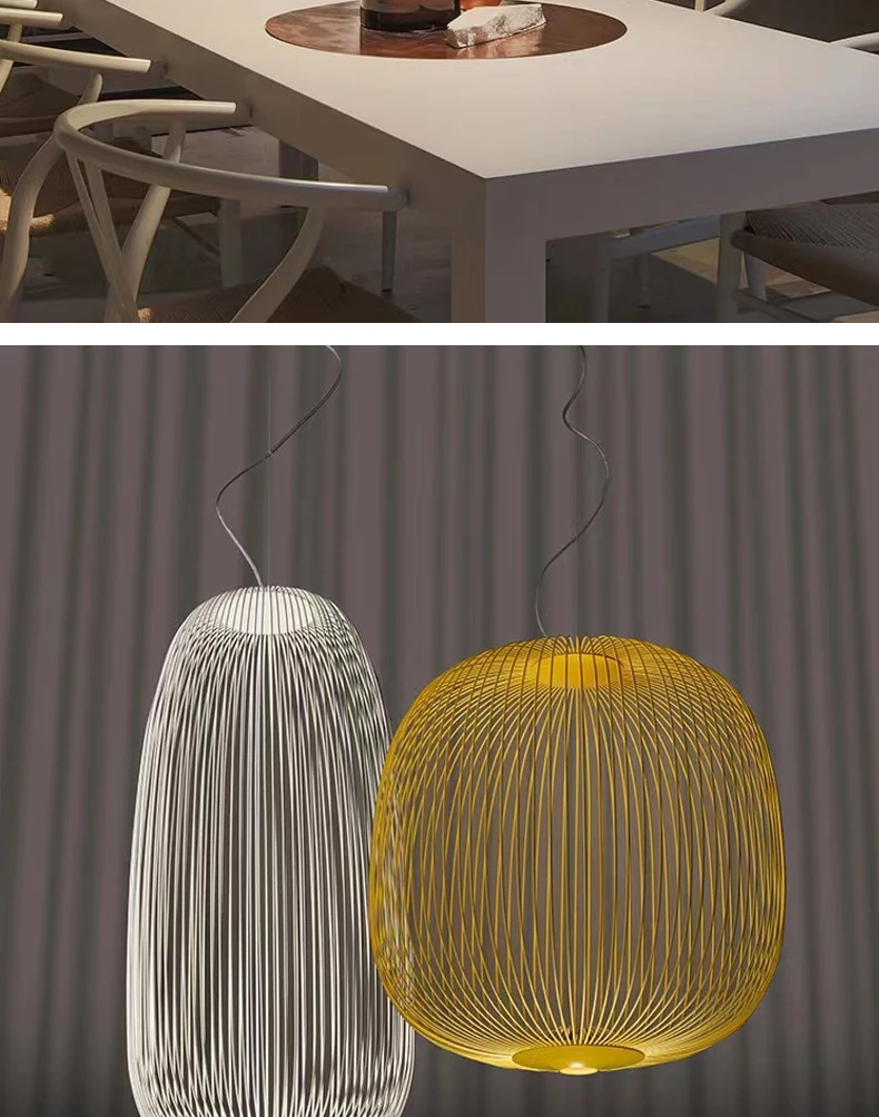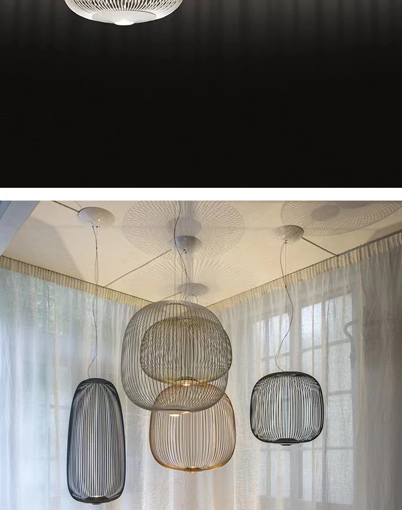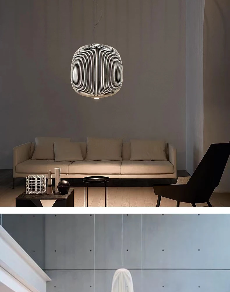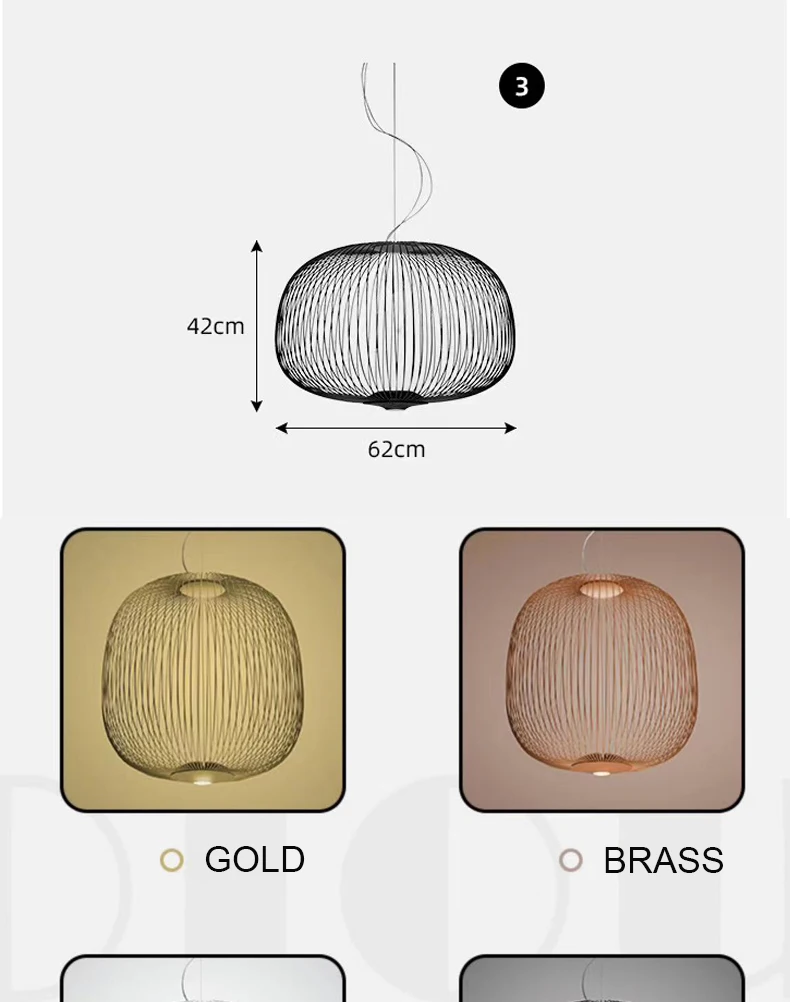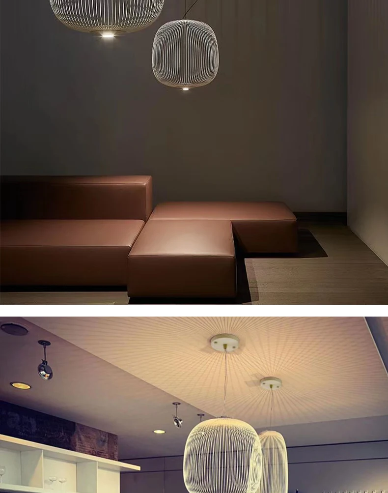 Elegant Foscarini Spokes bird-cage LED pendant lamp. A decorative light fixture offering warm, energy-efficient illumination—ideal for dining, living, or entryway.