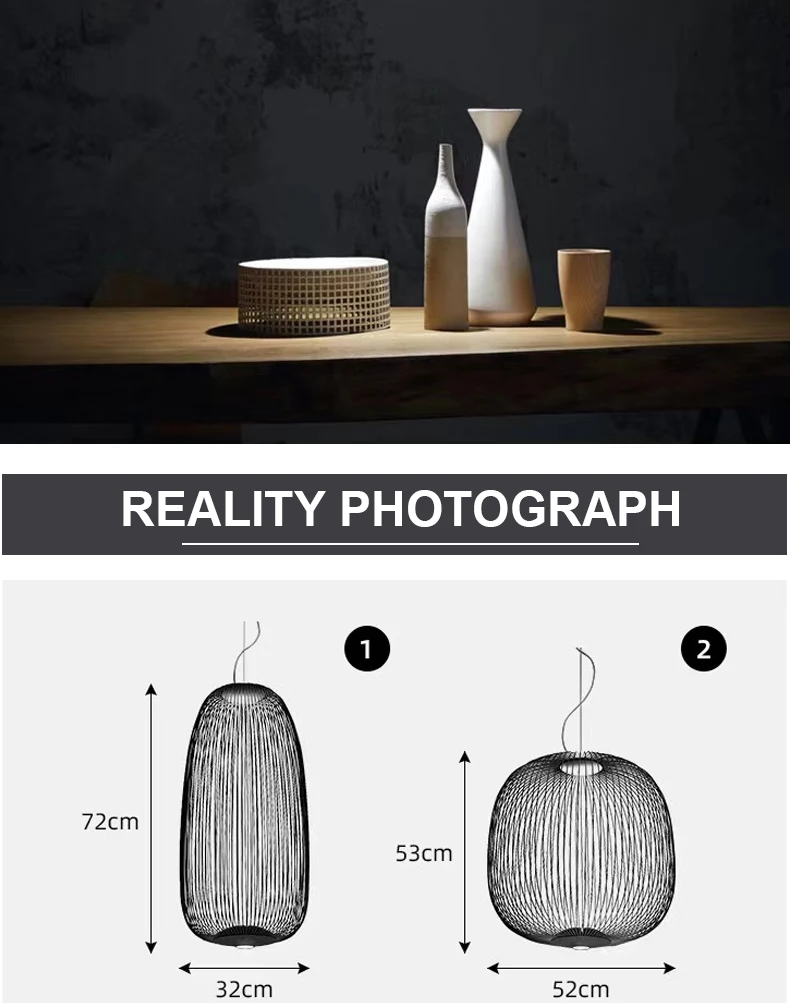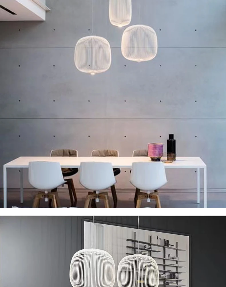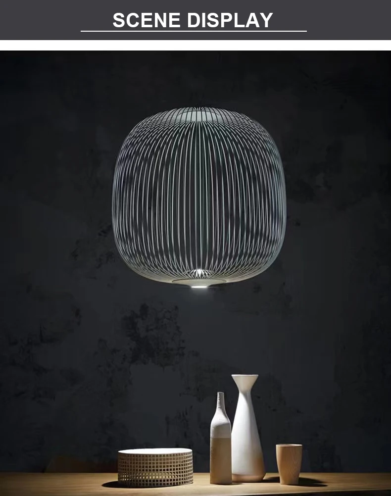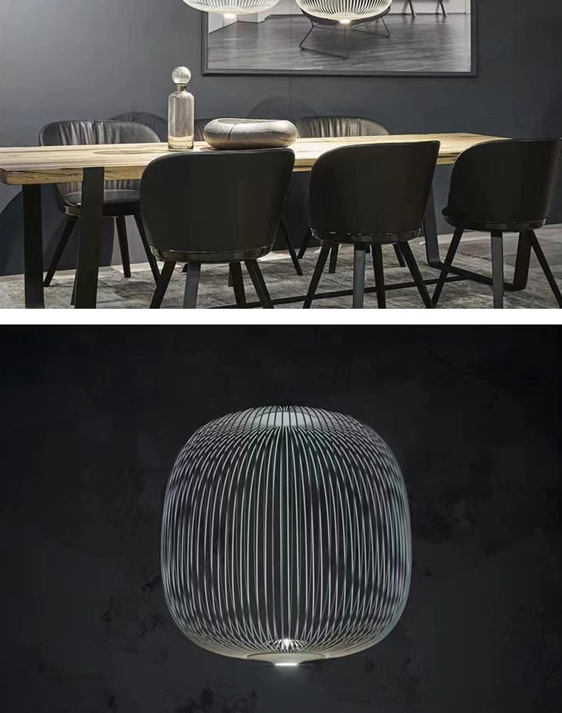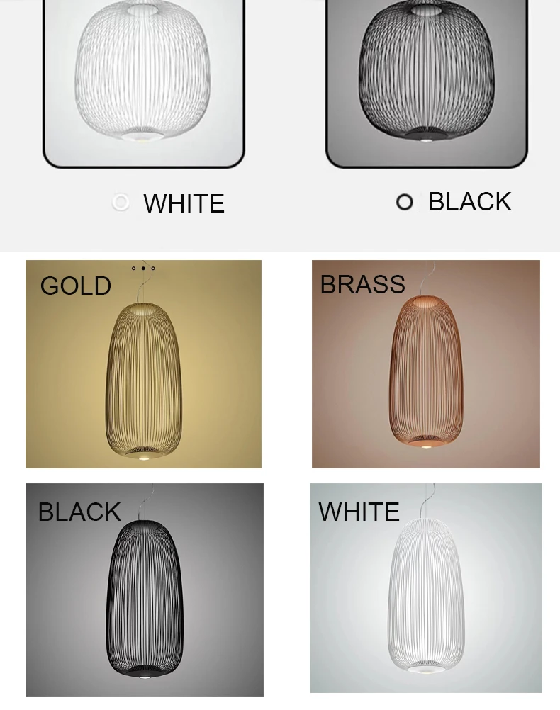 Elegant Foscarini Spokes bird-cage LED pendant lamp. A decorative light fixture offering warm, energy-efficient illumination—ideal for dining, living, or entryway.
