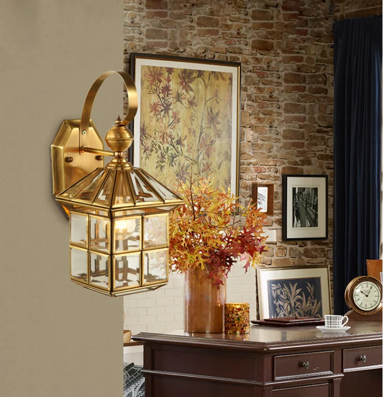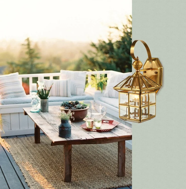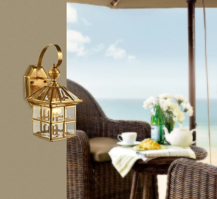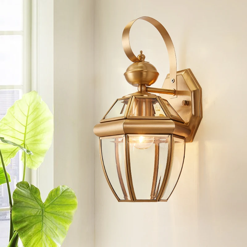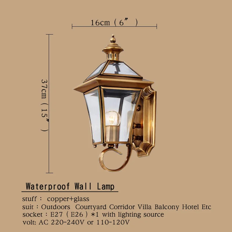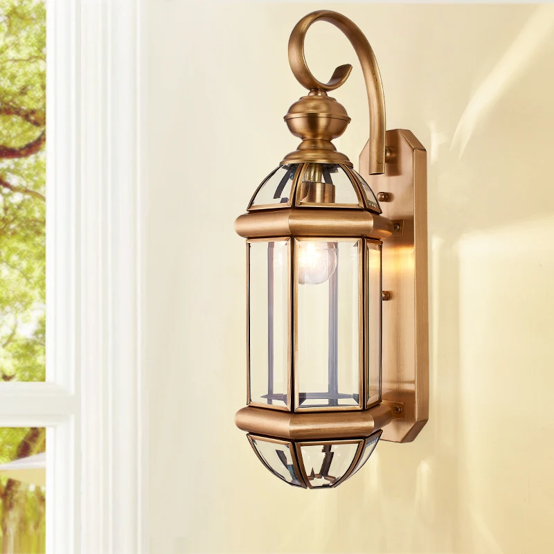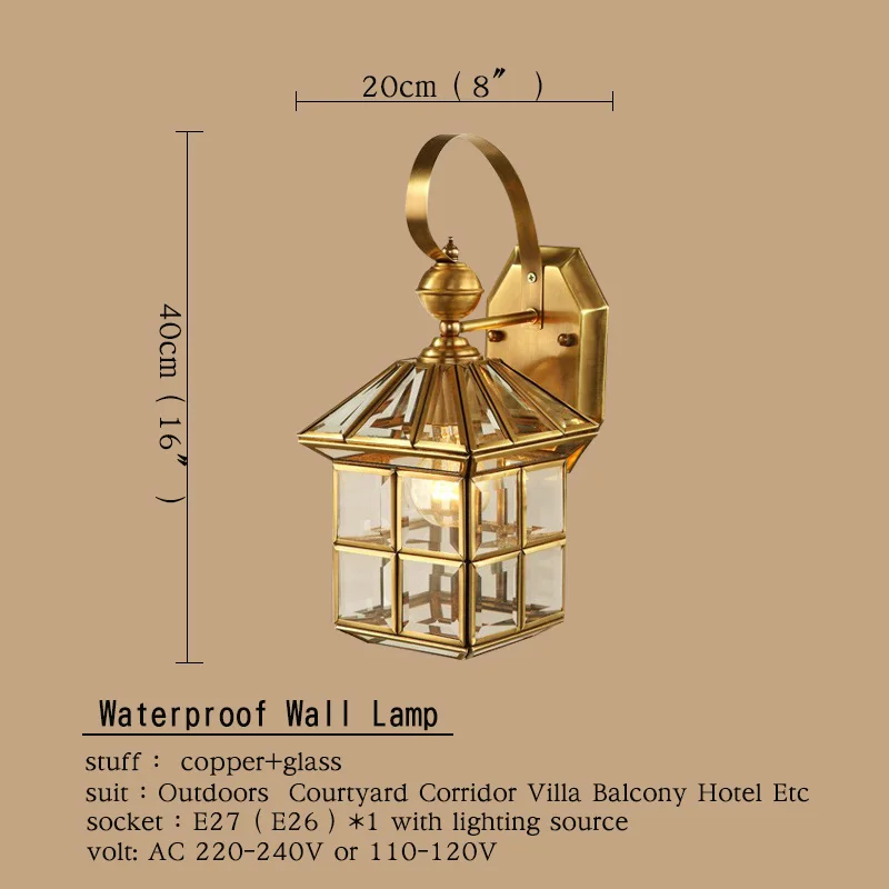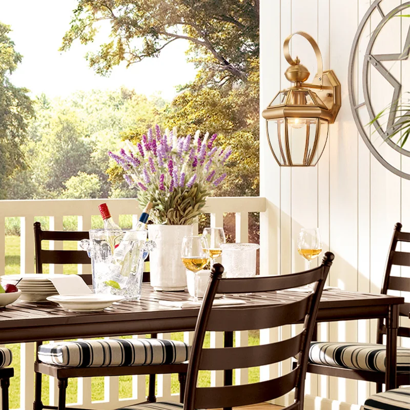 IP65 outdoor brass copper wall sconce with borosilicate glass. AC 85–265 V, warm 3000 K–4000 K LED. Perfect for villas, patios, courtyards, and hotel exteriors.