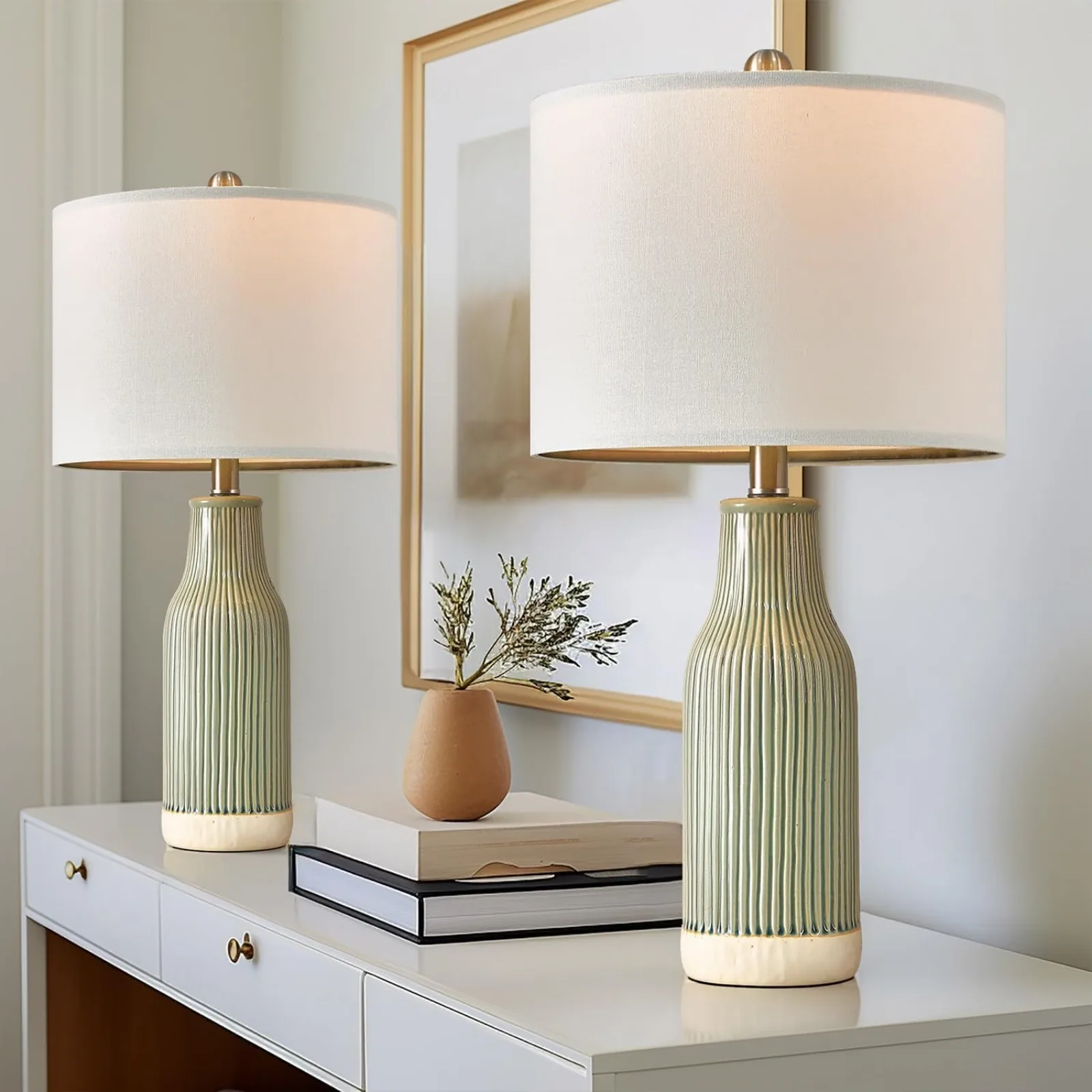 Stylish set of 2 green ceramic table lamps for bedrooms or living rooms. A modern, energy-efficient lighting option for bedsides, consoles, or desks.