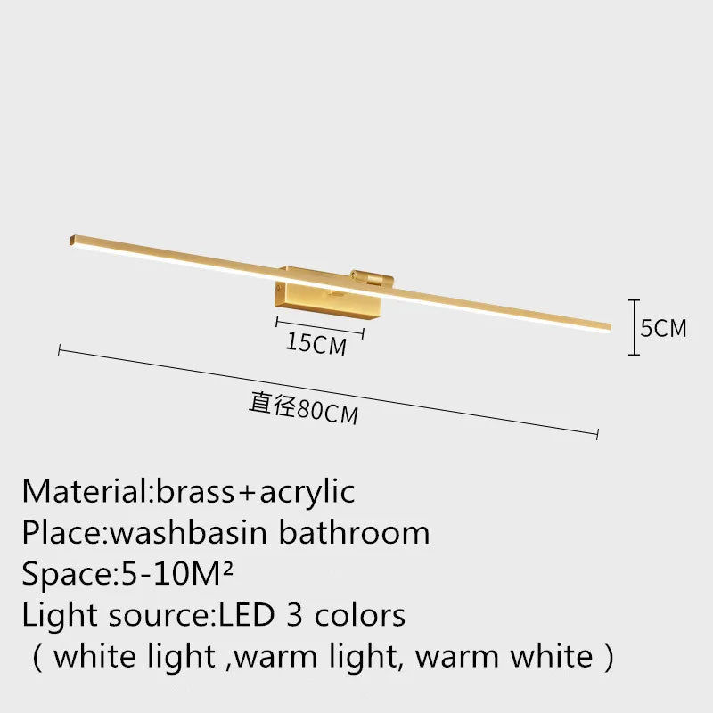 Sleek brass LED vanity mirror light fixture. Provides bright task lighting for bathrooms and dressing areas—energy-efficient, modern, and easy to install.