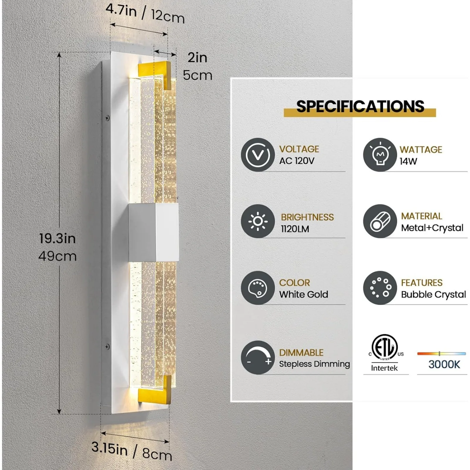 💡Dimmable & LED Wall Sconce - The Crystal Wall Sconce Included 14 watts LED (1120 Delivered Lumens, 3000K Warm White, 10-100% Stepless dimming adjust, Over 50000 hours of working life)to last longer and make energy saving(No bulbs required), LED fixture will last 10-50 times longer than traditional lighting products; ETL Approved in US and CA