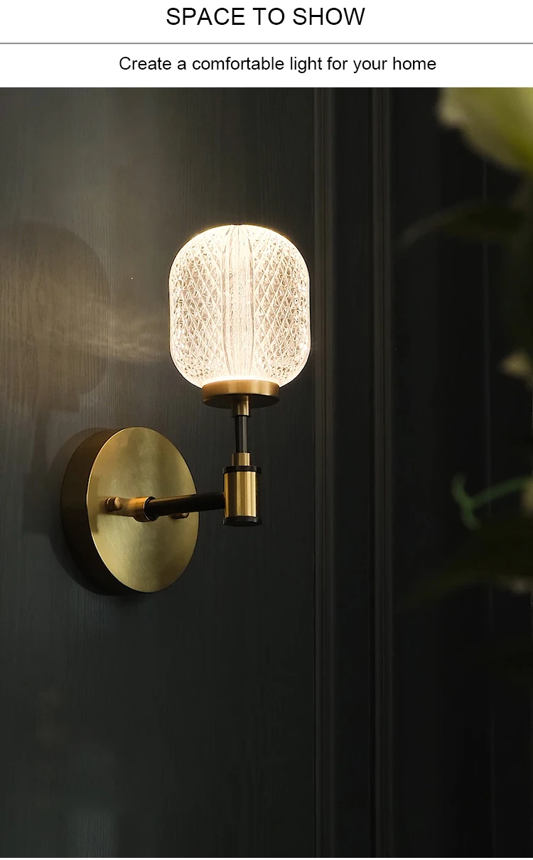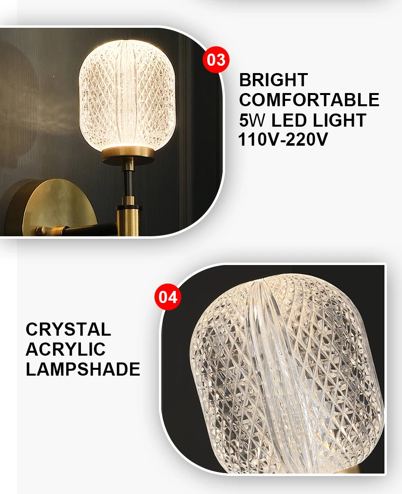 Mount it as a pair beside beds for stylish bedside lamps, or install it in hallways and living rooms to create eye-catching accent lighting. The faceted crystal elements refract the LED’s warm glow into soft patterns, while the acrylic body delivers even, glare-free illumination—ideal for task lighting when reading or working.
