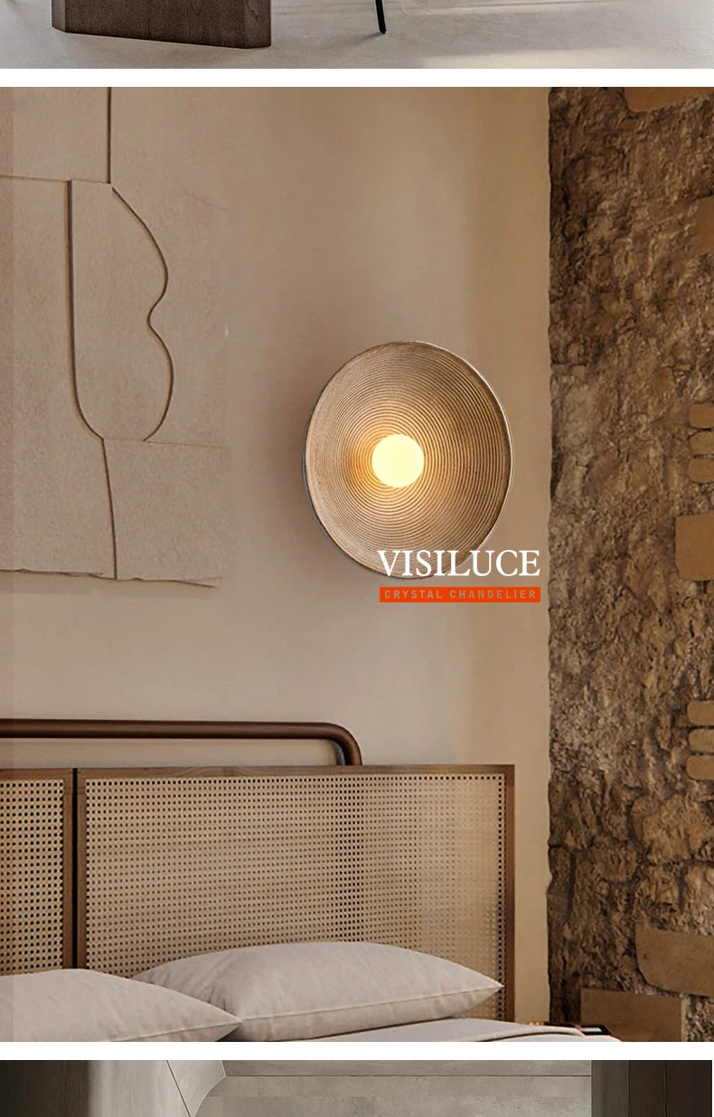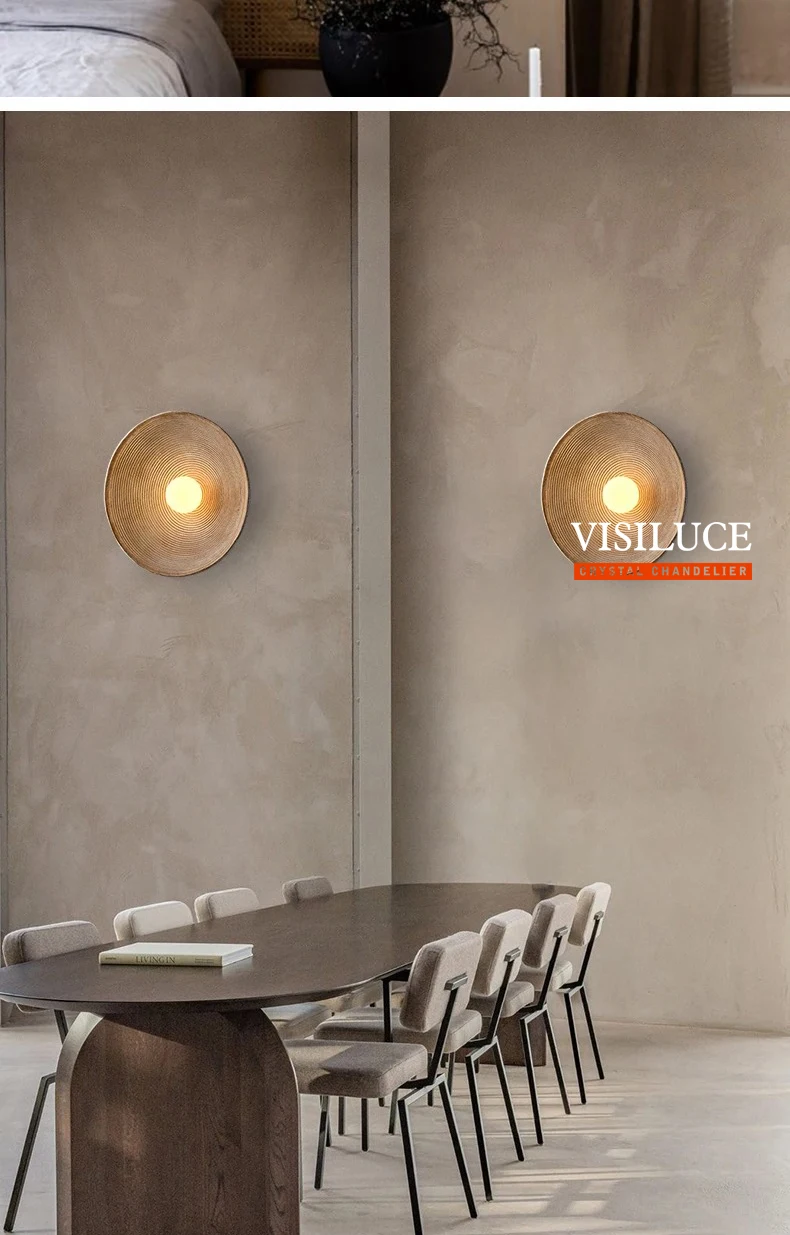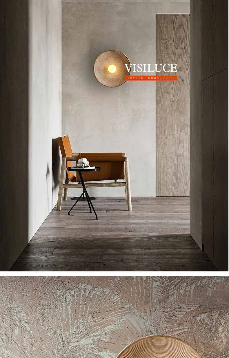 Retro round LED wall lamp in Japanese Wabi Sabi style. A simple light fixture ideal for bedside lamps, hallways, or ambient accent lighting in modern interiors.