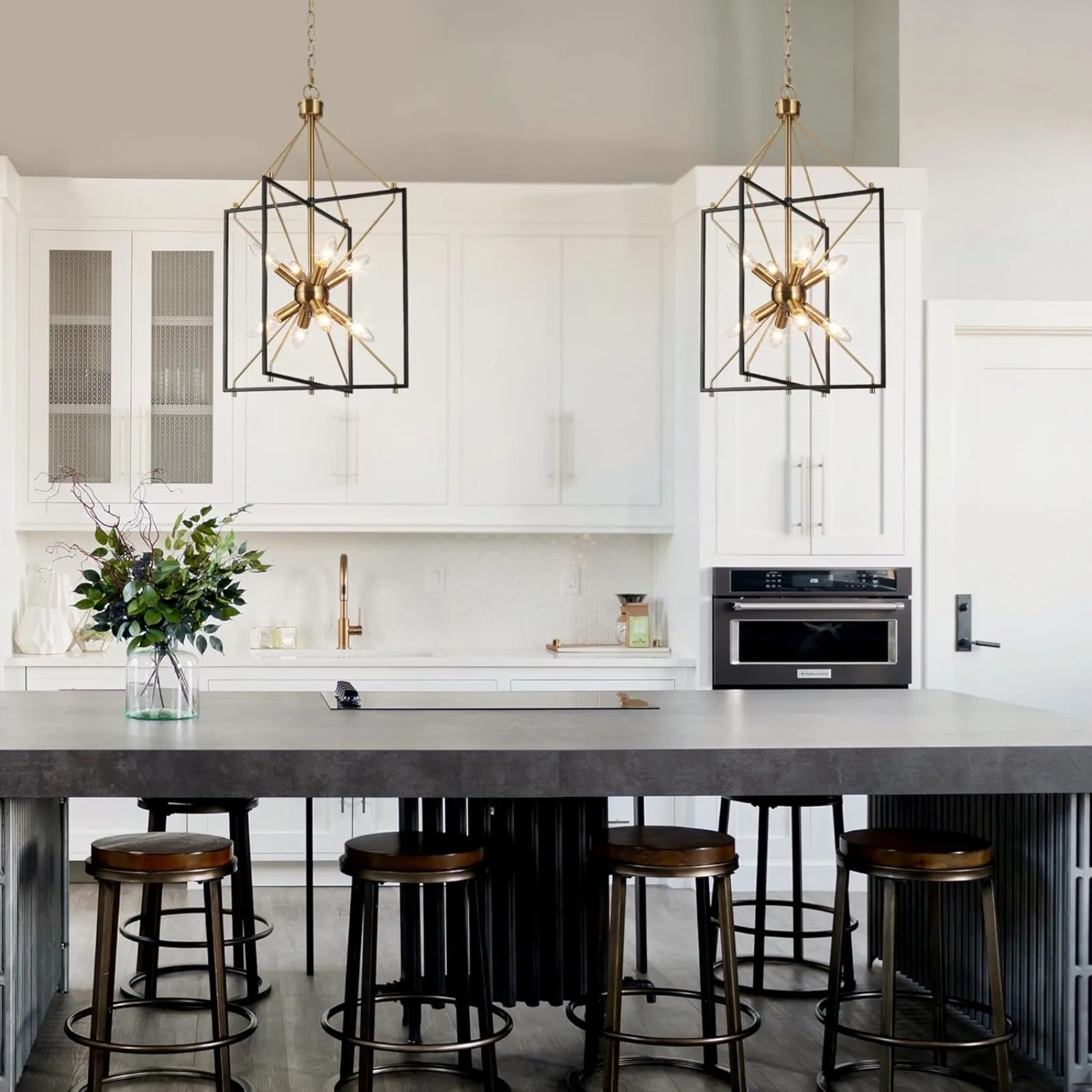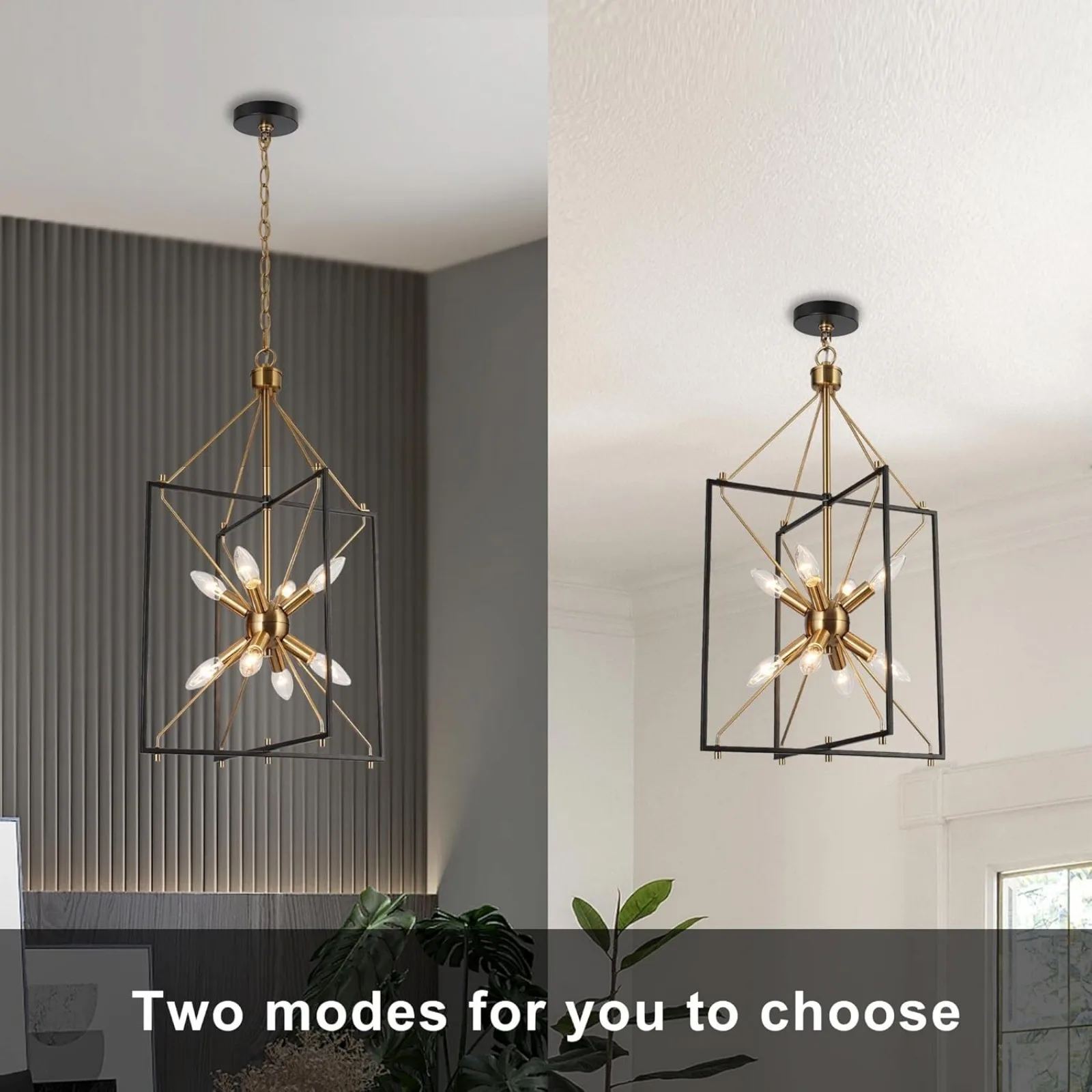 EXQUISITE DESIGN: The stunning cube chandelier combines modernity and industry, bringing unprecedented fashion elements to your space. The pendant light fixture is crafted with two black intersecting geometric rectangular frames, with a gold-finished sputnik cluster of 8 bulbs embedded in the center, producing a modern minimalist accent to your indoor place
