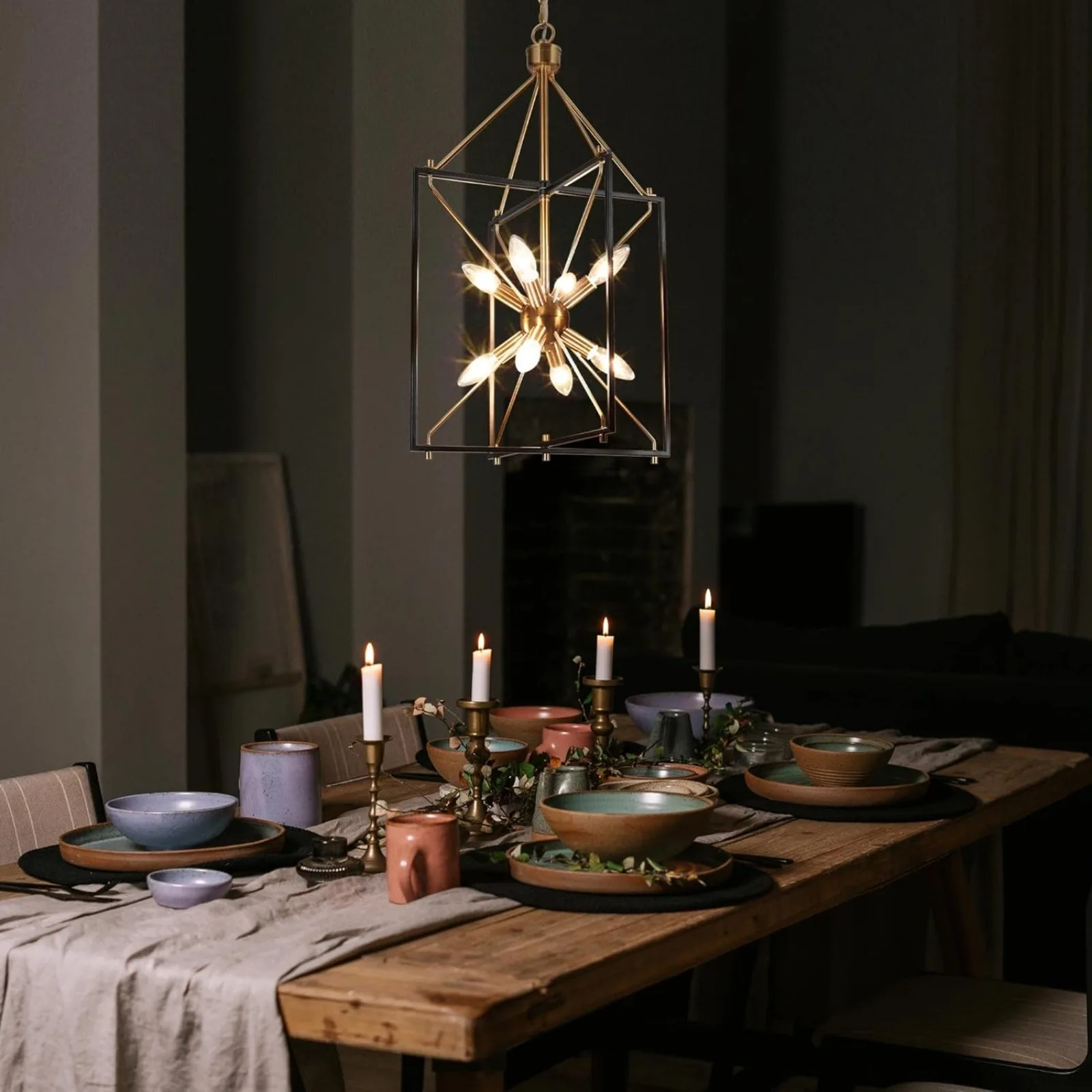 Bold 8-light gold and black chandelier with a geometric frame. A striking modern pendant light for dining rooms, foyers, or high-ceiling spaces.